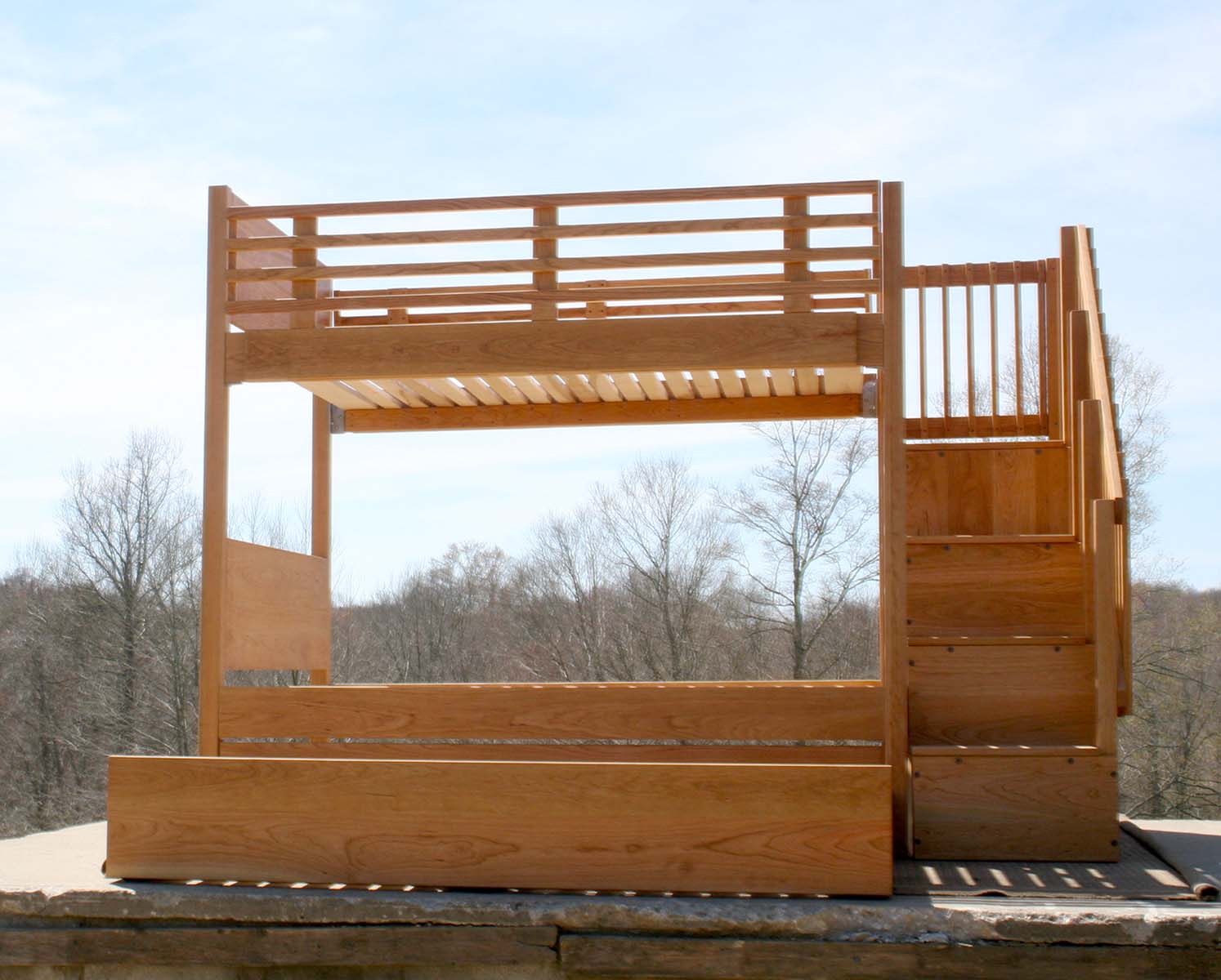 Versatile bunk bed with both stairs and trundle is perfect for both children and adults! Sturdy stairs make it easy for young people to get up and down to the top bunk and give extra storage underneath. The smooth-rolling trundle is handy when an extra bed is needed. The removable top railing at the sides easily lifts off and slides back on making it easy to make up the top bed sheets. The bed is custom made for you. Contact Us to request almost any change that you would like.