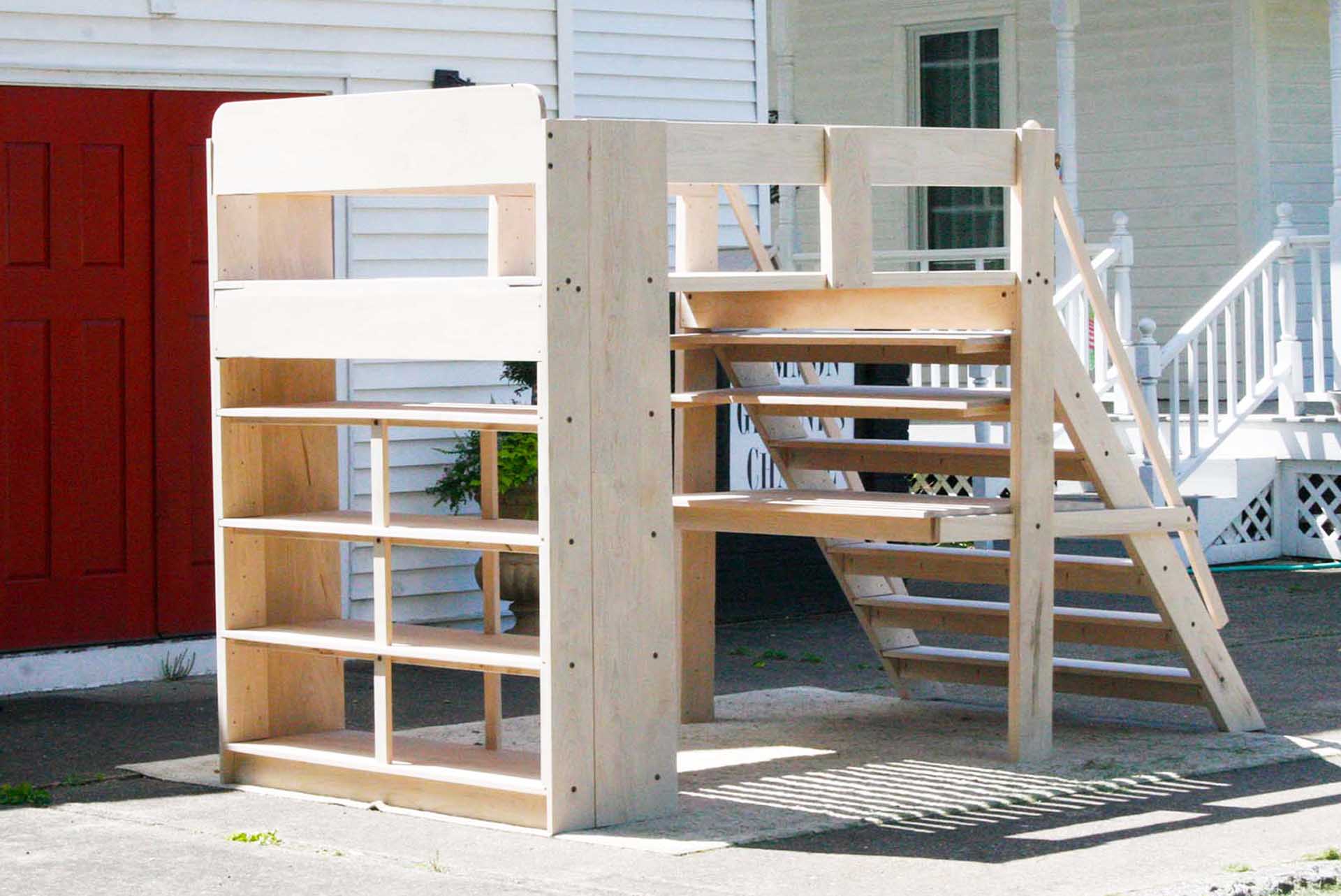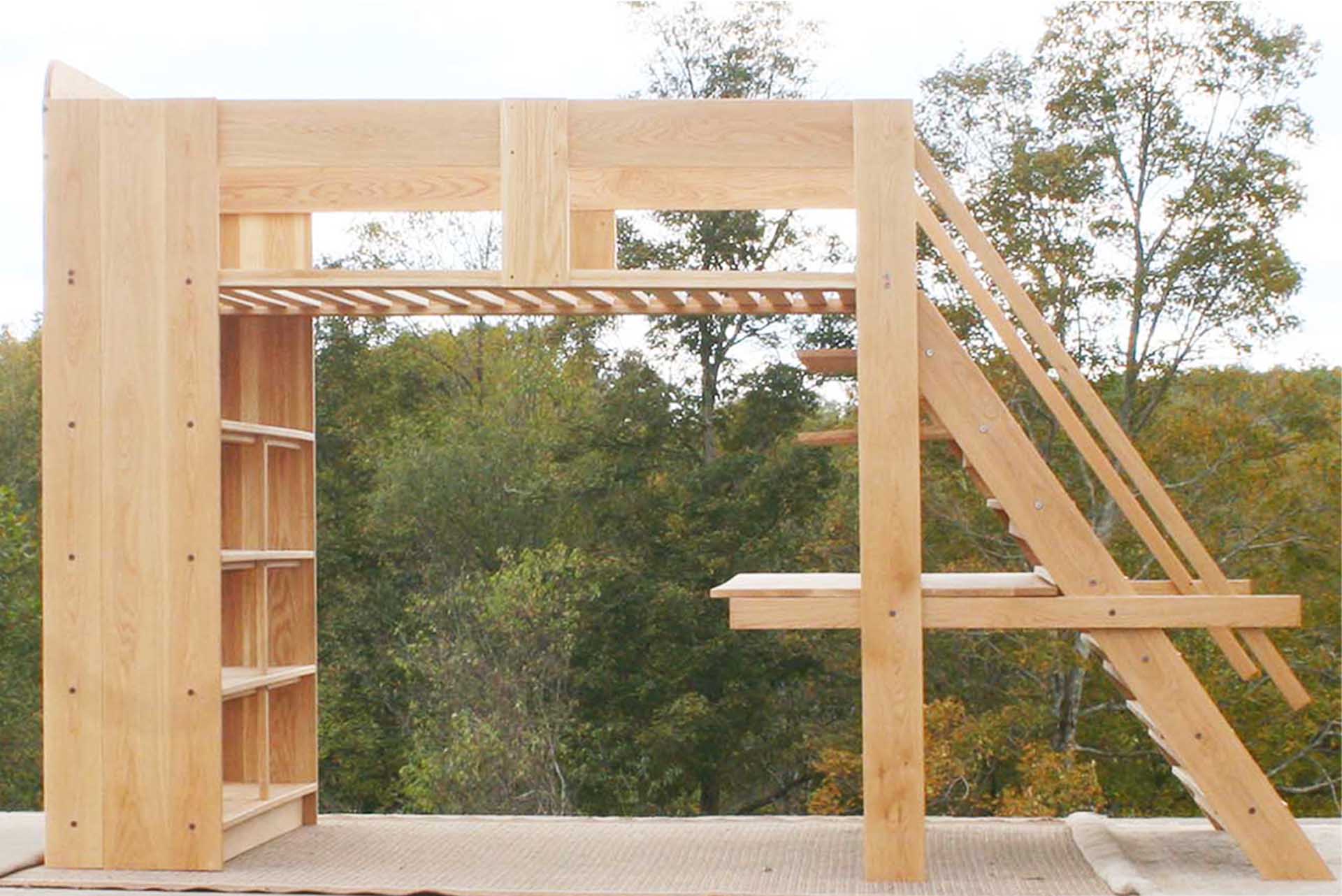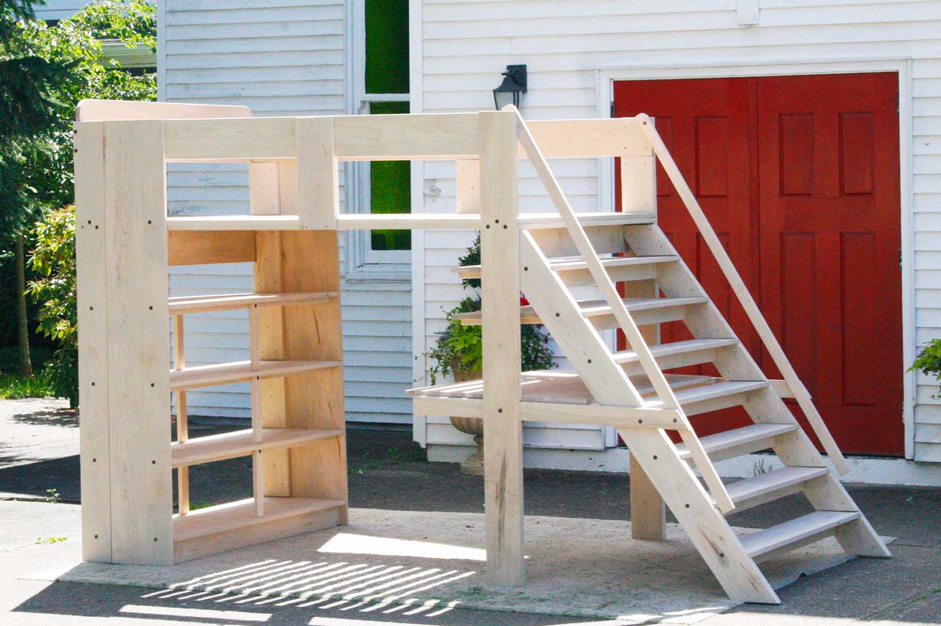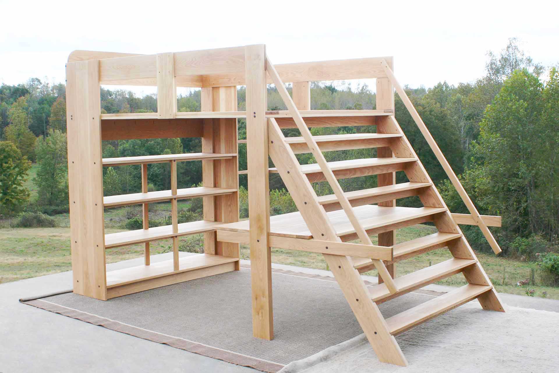 This is a loft bed with a desk underneath, full width sloped stairs, handrails, and medium depth shelves. It is everything you need to create a stylish and very functional bedroom! Customers tell us that adding a desk under a loft bed is one of the most functional loft bed options that we offer. The bed is custom made for you. Contact Us to request almost any change that you would like.