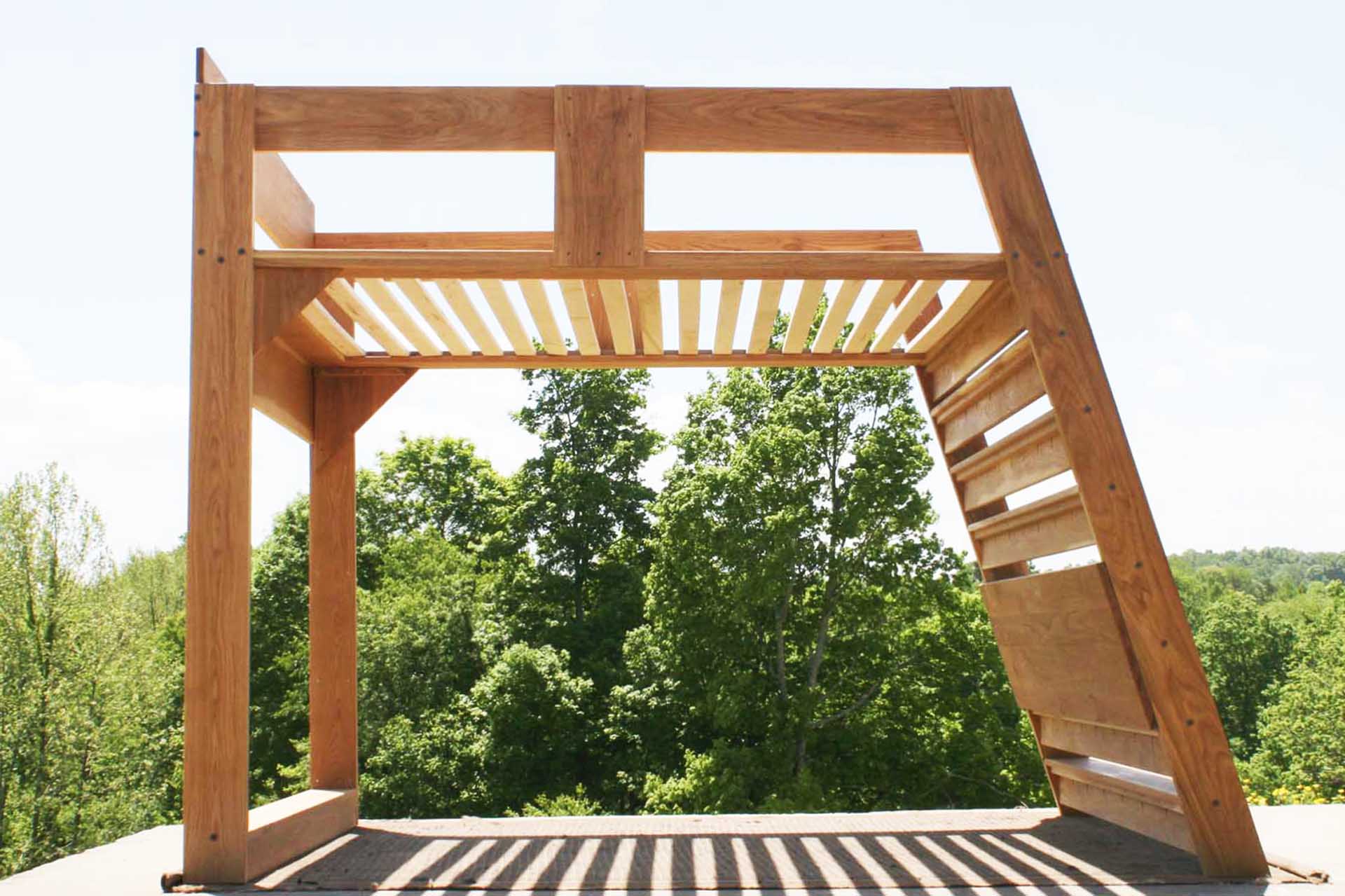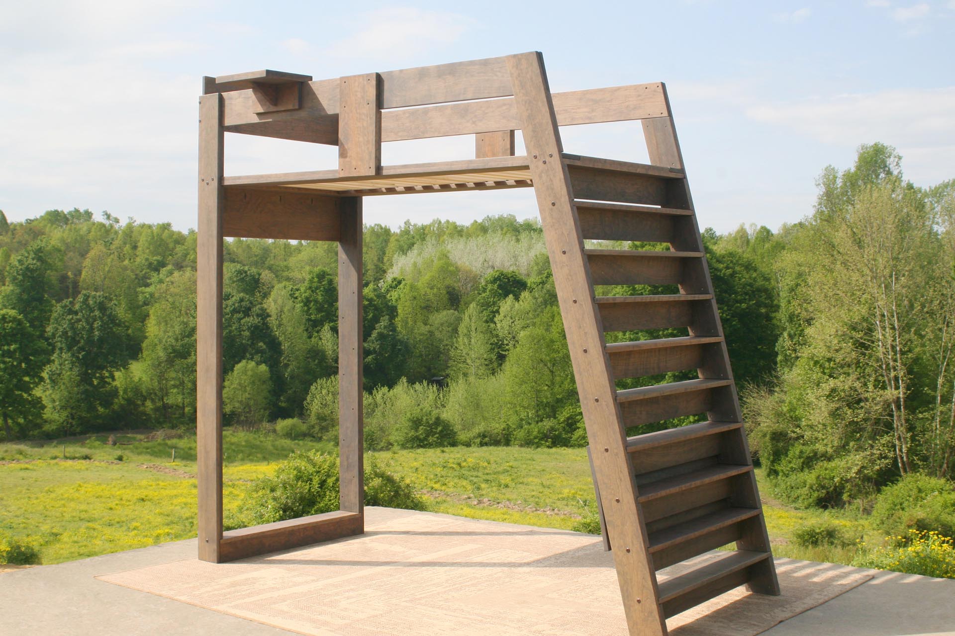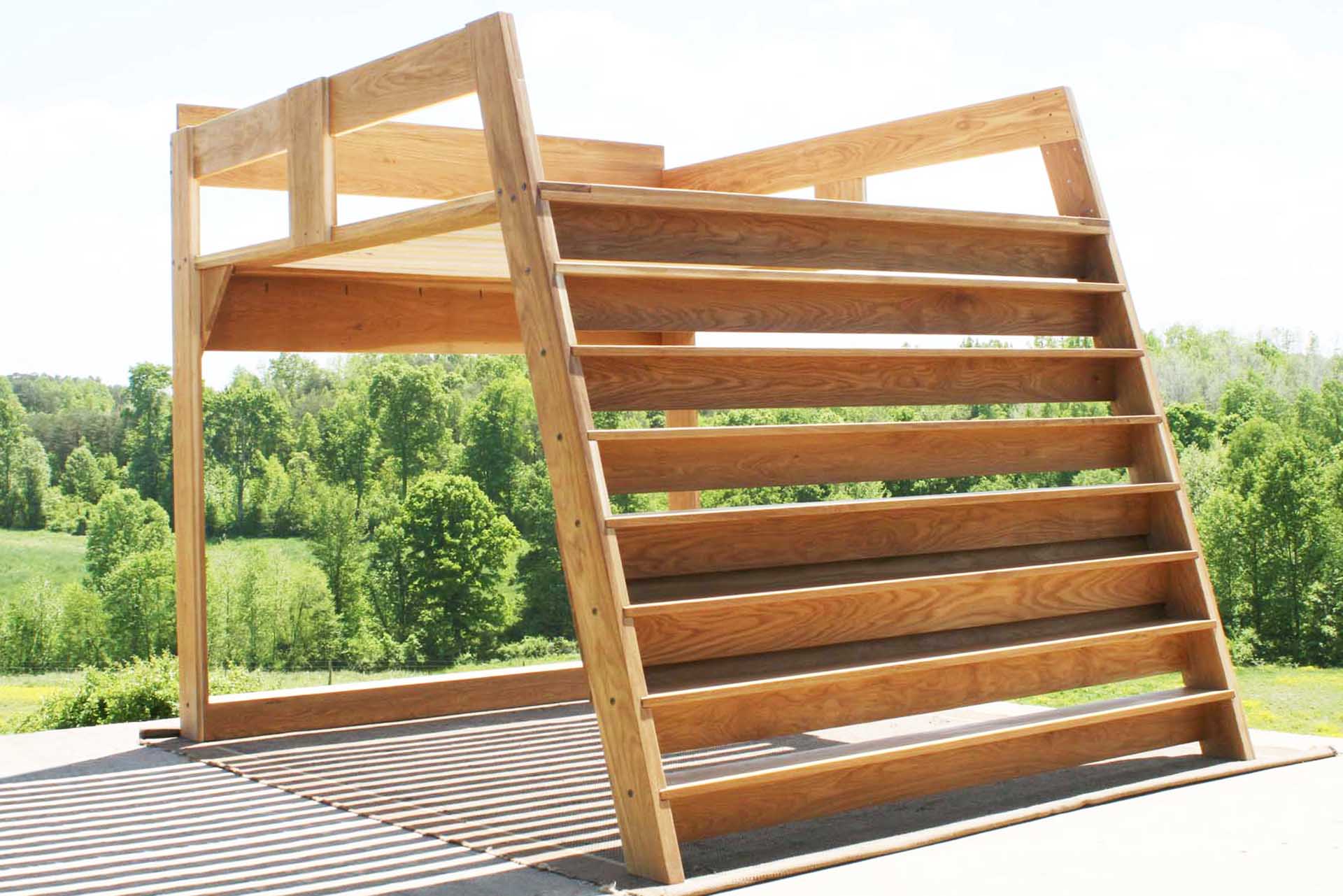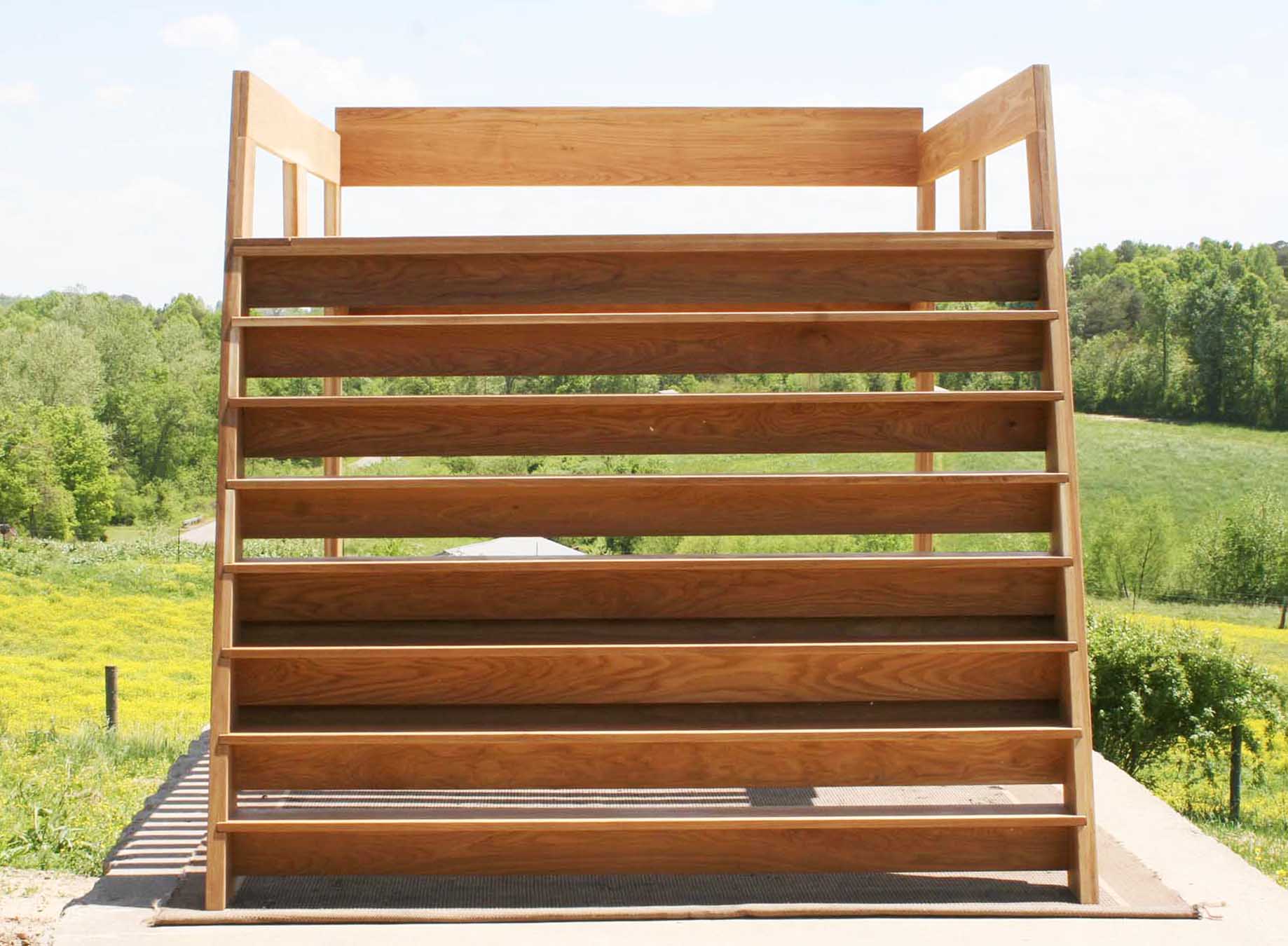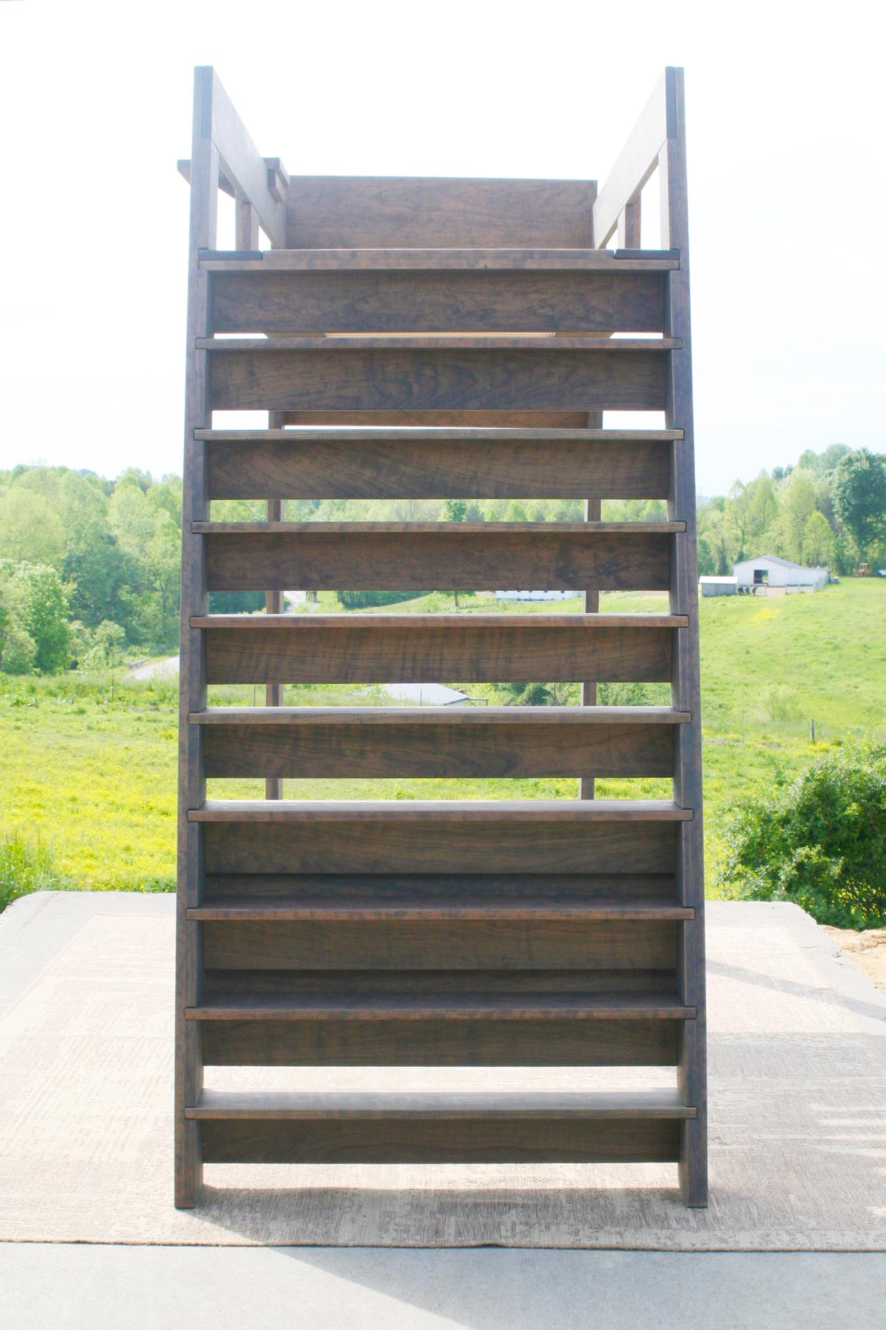 7. The stairs span the total width of the bed as shown in the photos, and are mounted at the foot end. The angle of the slope of the stairs is 15 degrees from vertical (75 degrees from horizontal).