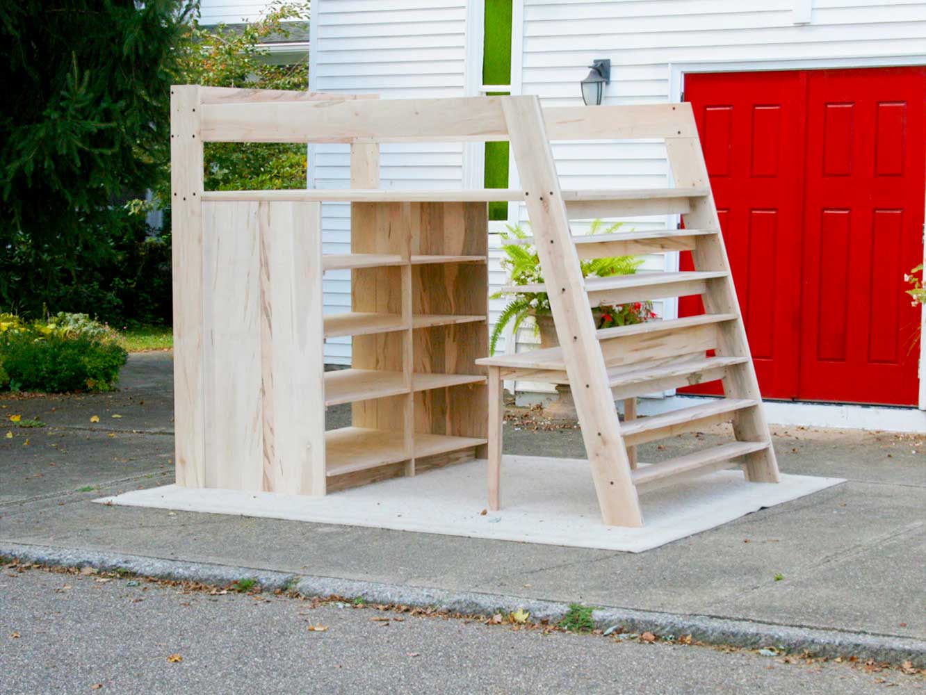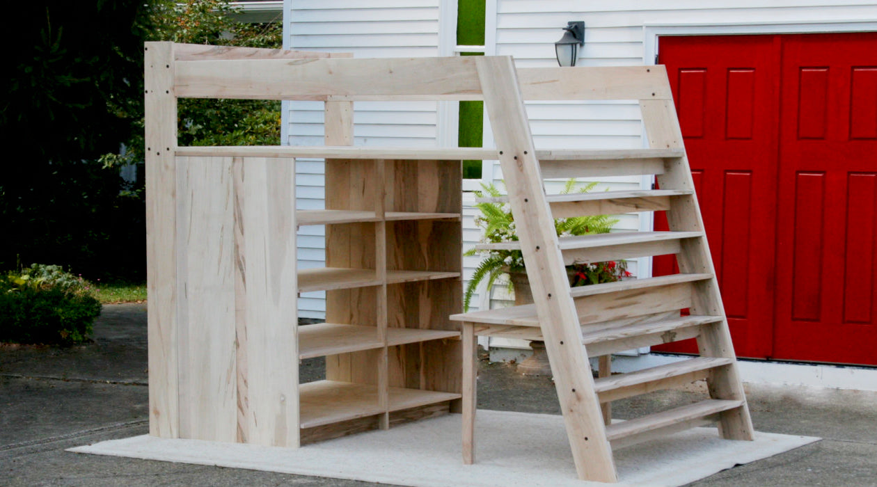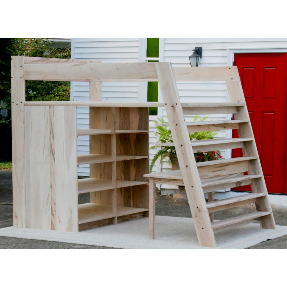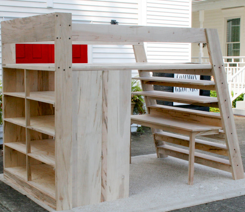 Sturdy and stylish loft bed with shelves and built in desk will make the most of your bedroom space! The bed shown in the photos is a Queen sized bed made from Wormy Maple with a natural Tung Oil finish. This creates a beautiful and extremely strong natural bed for both children and adults. This bed is custom made for you. Contact Us to request almost any change that you would like.