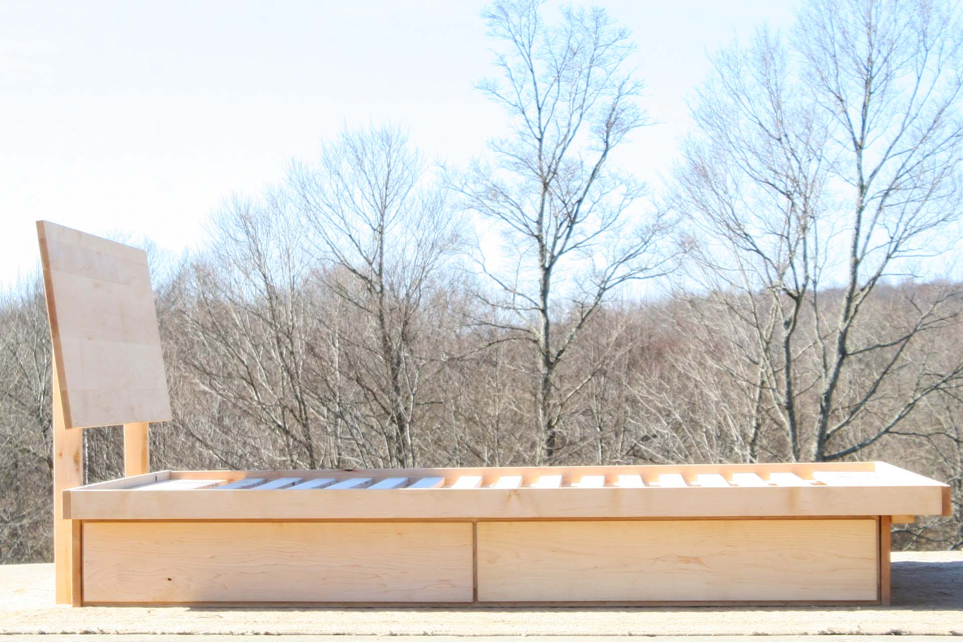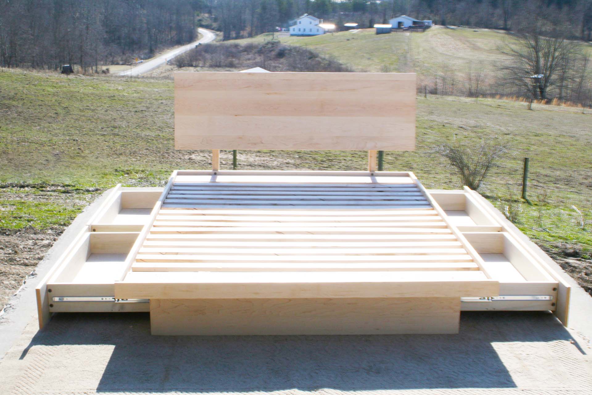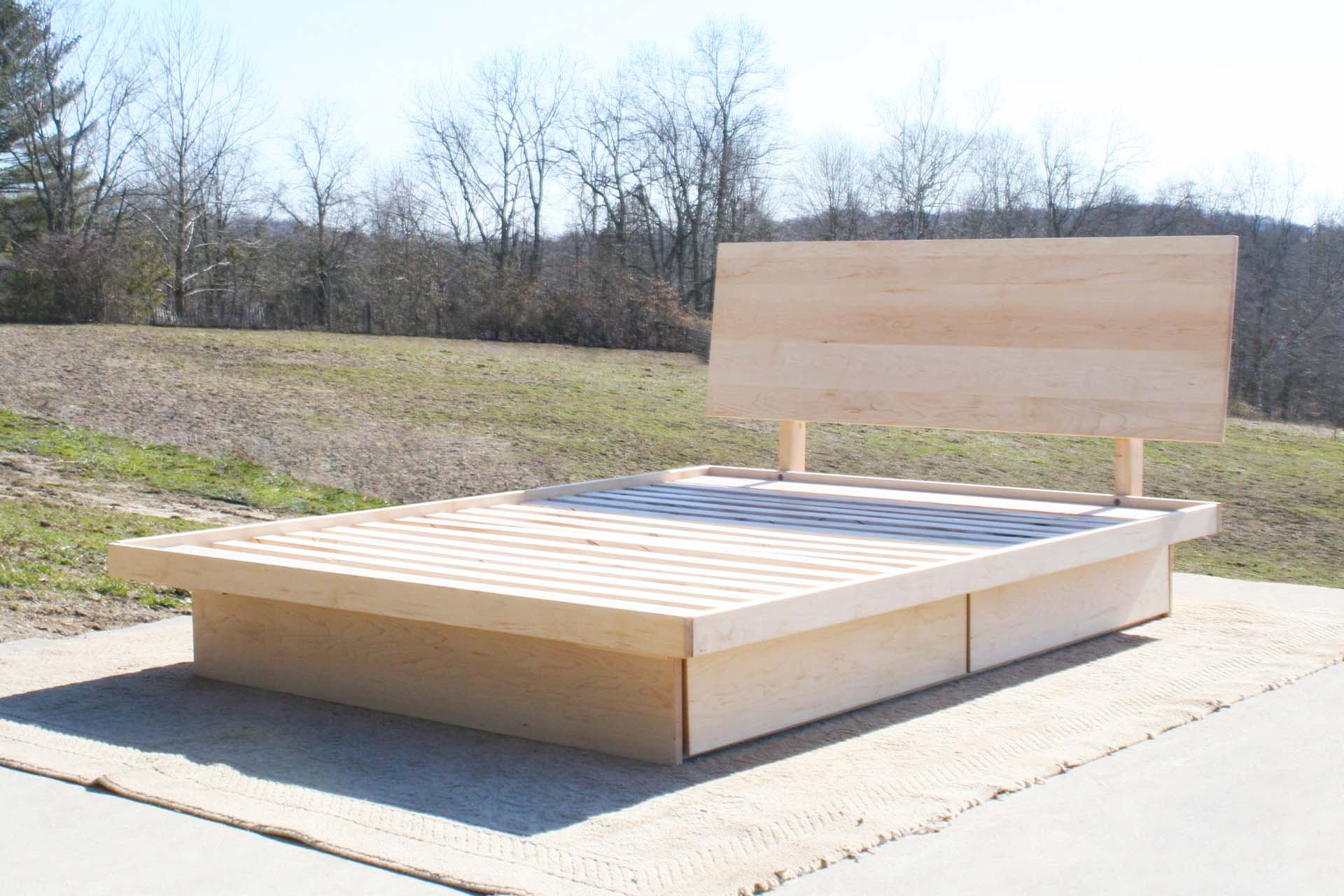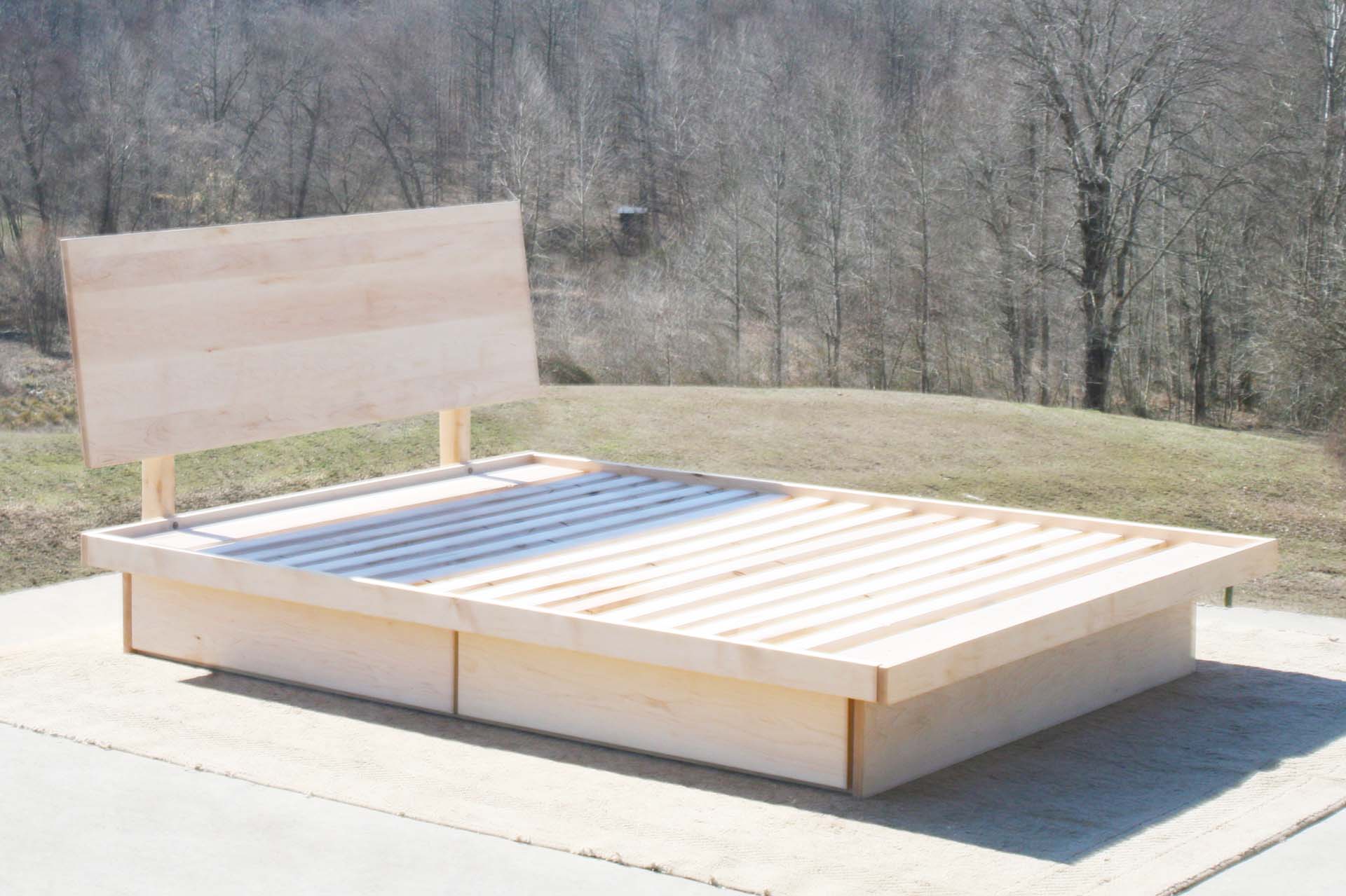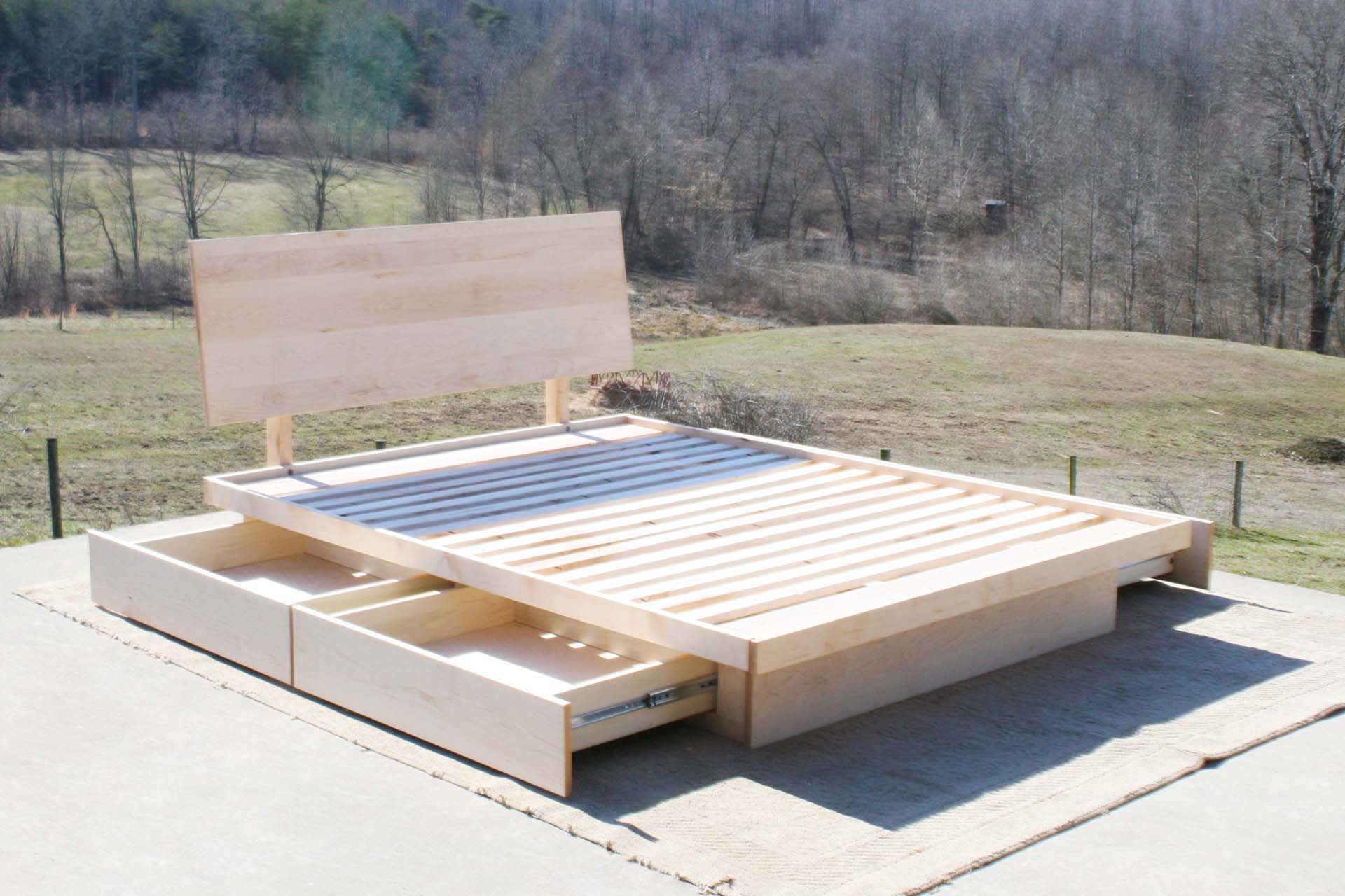 Low platform storage bed with 4 drawers neatly tucked under the cantilevered bed platform. Slanted headboard. This bed is custom made for you. Contact Us to request almost any change that you would like.